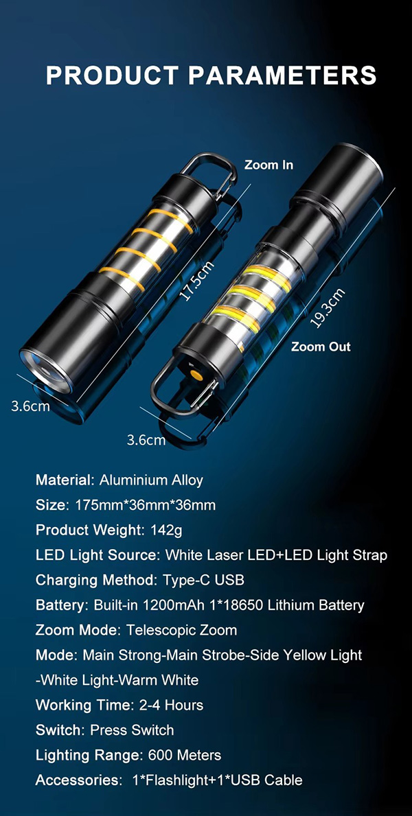 EF-3807AL Super Bright White Laser Multi-Function Rechargeable Tactical Flashlight Long Life Portable for Outdoor & Indoor Use with Atmosphere Soft LED strip Type-C function